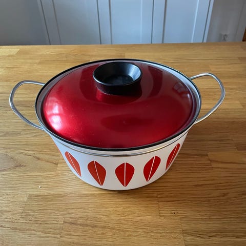Cathrineholm Lotus kasserolle med lokk, 1,5 liter kapasitet, i grønn emalje med hvite bladmønster. Kasserollen har rustfritt stål håndtak og lokk med metallhåndtak. Egner seg kanskje best til pynt. Selges som den er, se bilder.
