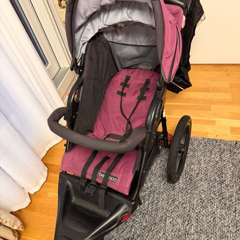 Beemoo barnevogn med blå og svart farge. Barnevognen har tre hjul og justerbar sele for sikkerhet. Designet for barn, egnet for utendørs bruk.