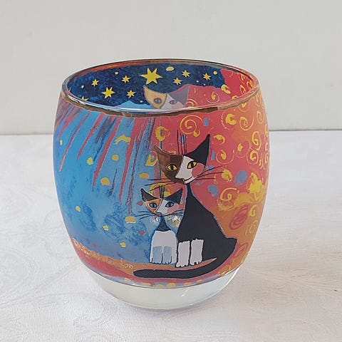 Selger en dekorativ og sjarmerende telysholder fra Rosina Wachtmeister, kjent for sine fargerike og uttrykksfulle kattemotiver. typisk for 1990–2000-tallets kunstglass og dekorserier.