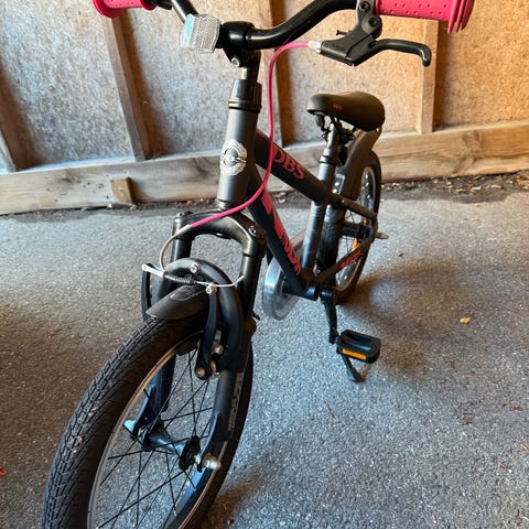 Trek barnesykkel med støttehjul, svart ramme, og håndtak for enkel skyving. Egnet for små barn som lærer å sykle, med justerbart sete og håndtak for kontroll og sikkerhet.