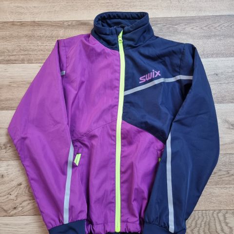 Dressen består av jakke og bukse i fargene lilla og mørk blå.
