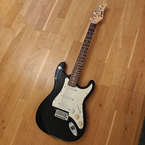 Svart Morgan legend series med utgang for forsterker, gitaren er ikke brukt veldig men har merker. Kommer med oppbevarings ryggsekk/bag og strap for å feste rundt nakke + forsterker