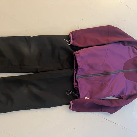 Sett bestående av jakke og bukse i rødt og mørkeblått. Egnet for ulike sportsaktiviteter.