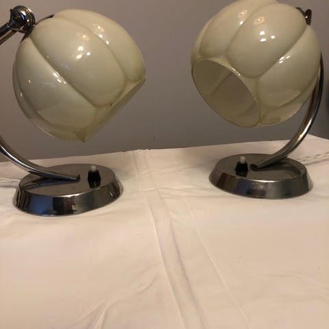 Art DECO nattbordslampe anno 1930-tallet, lampen er i krom med en pudderrosa opalin glasskuppel, hvit stoffledning og nytt støpsel.