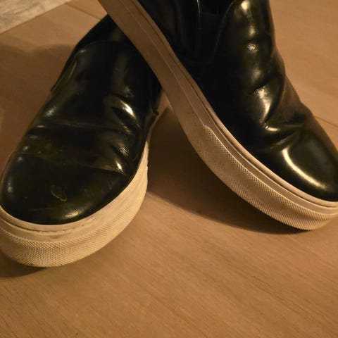 Logoen kan tas av og på. Skoene er nesten ikke brukt, men har noe lett slitasje helt foran på tuppen, som er lite merkbart.