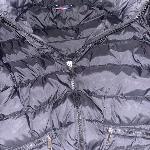 Moncler Annet yttertøy dunjakke i størrelse M for dame. Jakken er svart og laget med dun klasse 1 som materiale, noe som gir god isolasjon. Den har hette og detaljer som pelskant på ermene.