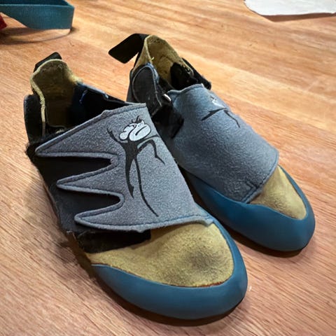 Mad rock klatresko grå og svart, damemodell. Størrelse 39. Nokså liten i størrelsen - mer 38. Brukt av barna våre når mad rock barneskoene ble for små. Har bittelite hull bak, (se bilde) har ikke betydelse for bruken. Pris: 350 kr.