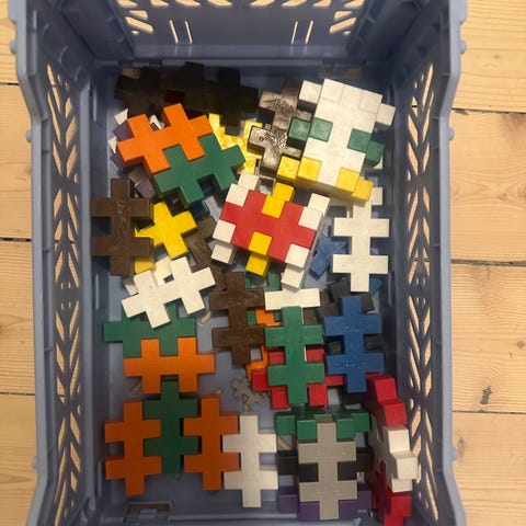 Det er nok ikke nøyaktig 600 deler i esken nå, men som bildet illustrerer er boksen fremdeles ganske full. Selve boksen er slitt og teipet.