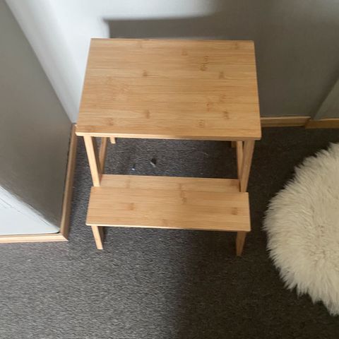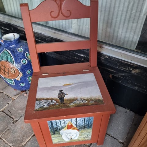 En liten stol, passer godt til barn. Den har også oppbevaring.