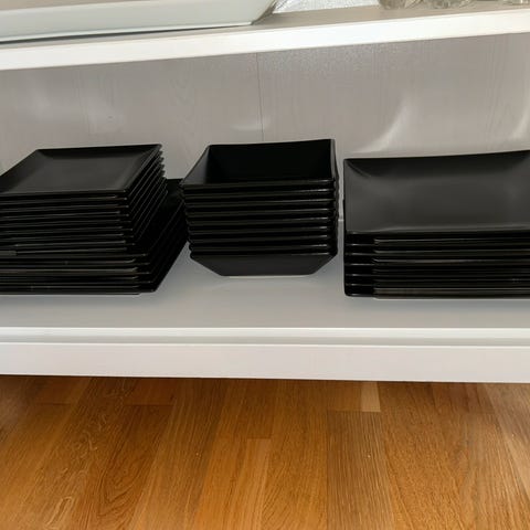 12 krus,12 asjetter,12 middagstallerkner,12 grøtboller/skåler,3 serveringsskåler,2 store runde serveringsfat,3 ovale mindre serveringsfat. Selges helst samlet til hbo kr 7.500,- + frakt. Kan også deles opp.