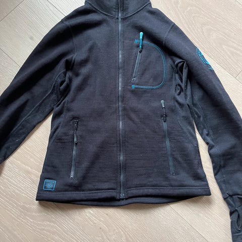 Med 3 lommer og hull til tommel for at den skal sitte godt. 100% merinoull. Tung og solid i stoffet. Denne er lite og pent brukt.