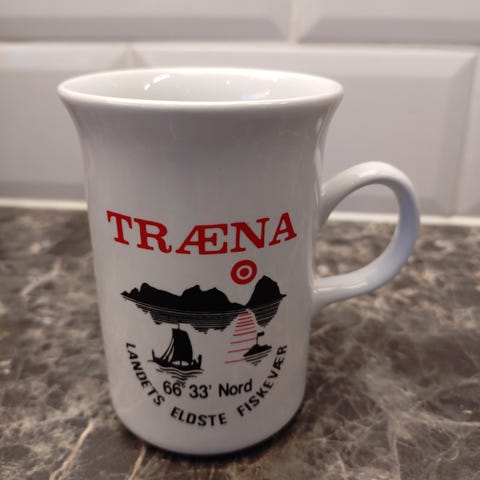 Ubrukt kopp / krus med Træna motiv, kjøpt på Træna i beg. av 90 tallet