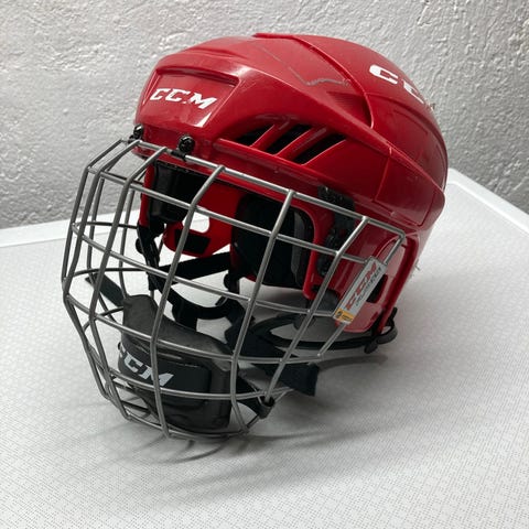CCM ishockeyhjelm med integrert gitter i hvit farge. Hjelmen er designet for ishockey og gir beskyttelse til hodet og ansiktet under spill. Str XS, passer til barn opptil ca 6år