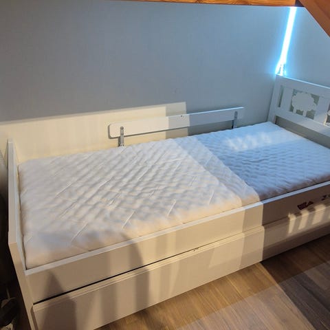Myk madrass og Stabil sengeramme. Plass til Lego kasser under