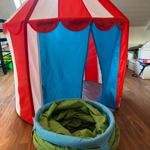 IKEA barntelt med blå og hvit stripet mønster. Teltet har vindu og døråpning, laget i stoffmateriale. Passer til lek innendørs og utendørs for barn.