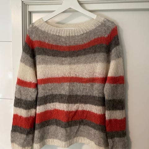 Nydelig ullgenser fra Part Two. Stripete i sort, grått og terracotta.