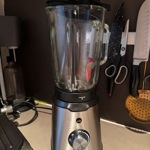 Design og materialer: Den har et robust plasthus, kniver i rustfritt stål og en glassmugge på 1,5 liter.