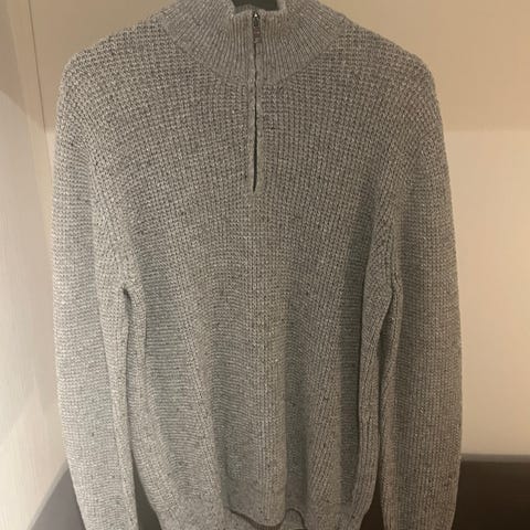 Laget av ullmateriale. Genseren har rund hals og en brystlomme.