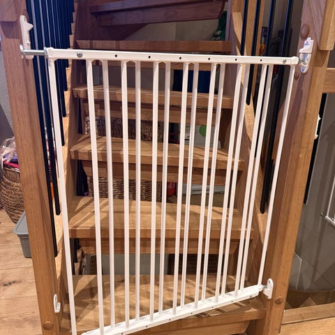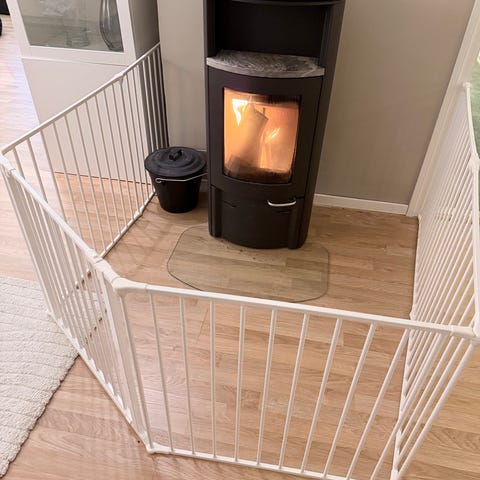 BabyDan peisgrind i svart metall. Grinden er designet for å sikre områder og hindre barn i å komme nær varme ovner eller andre potensielt farlige steder. Den kan settes opp i ulike konfigurasjoner for tilpasning til rommets behov