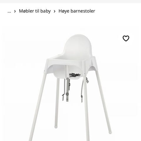 IKEA høy barnestol i hvit farge. Stolen har en avtakbar brett og sikkerhetsbelter for barn. Designet for bruk ved spisebordet for små barn.