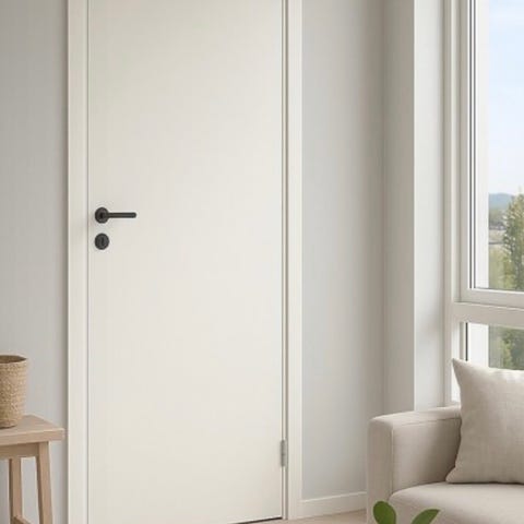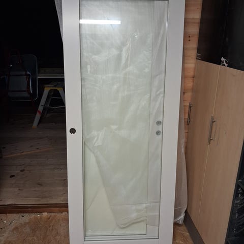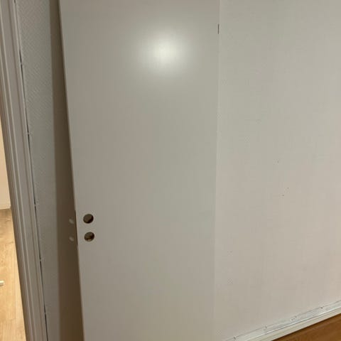 80x210 massiv hvit skyvedør med skåler, draring og frest spor i bunn.