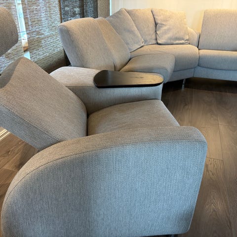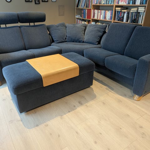 Dette er en stressless sofa der hver sittedel har bevegelige rygger for komfort. Du kan dermed justere din egen sittedel akkurat som du vil, mens den ved siden av kan justere sin egen annerledes. De høyeste setene kan i tillegg justeres i høyden. Alt dette prøvd å vise på bildene.
