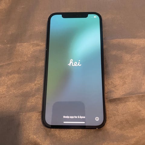 Apple iPhone 12 mobiltelefon med 128 GB lagringskapasitet i svart farge. Batterikapasiteten er på 85% med optimalisert batteriinnstilling aktivert. Telefonen leveres med original eske uten lader.