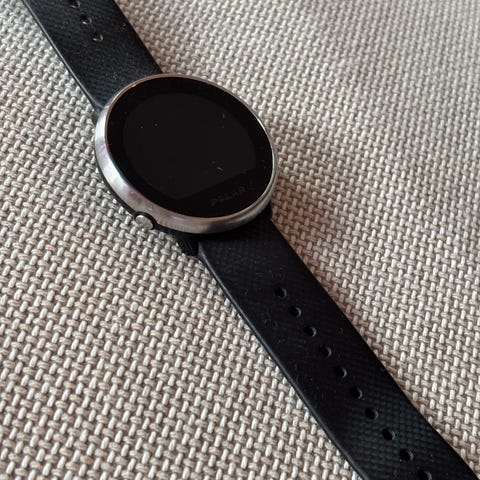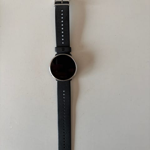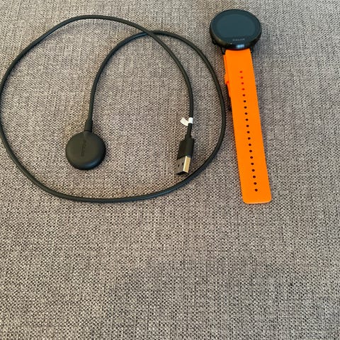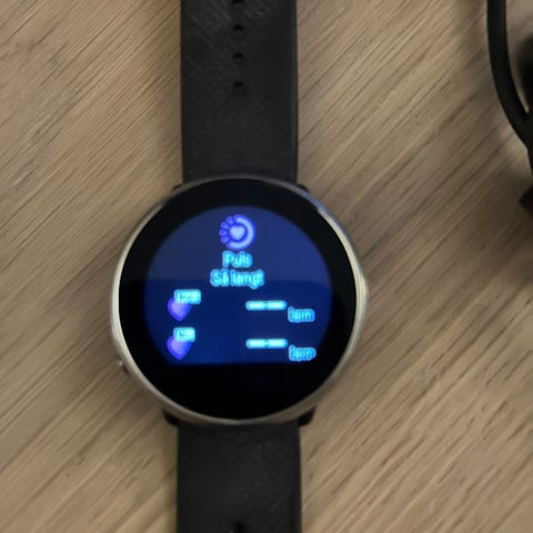 Polar ignite smartklokke med hvit rem. Klokken har en rund skjerm og viser tid, dato og treningsdata. Leveres med ladekabel for opplading. Egnet for bruk under trening og daglig aktivitet.fungerer bra.