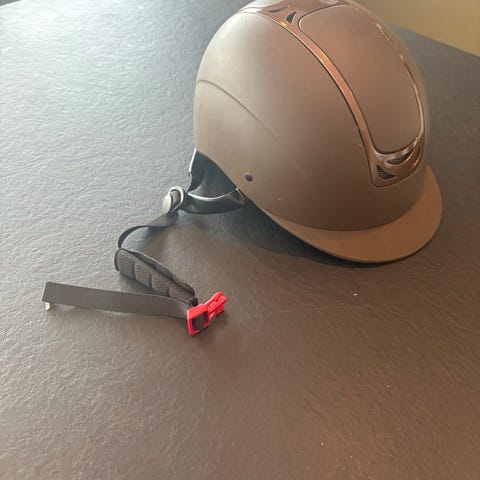 Hjelmen har justerbar stropp for sikker passform. Nesten ikke brukt.