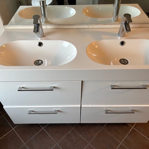 Servant i hvit porselen fra IKEA med integrert armatur, også fra et IKEA. Passer for montering på vegg eller benk. Har avløpshull og ettgrepsarmatur.