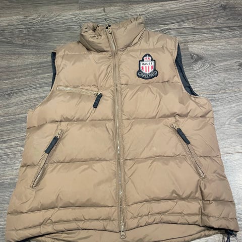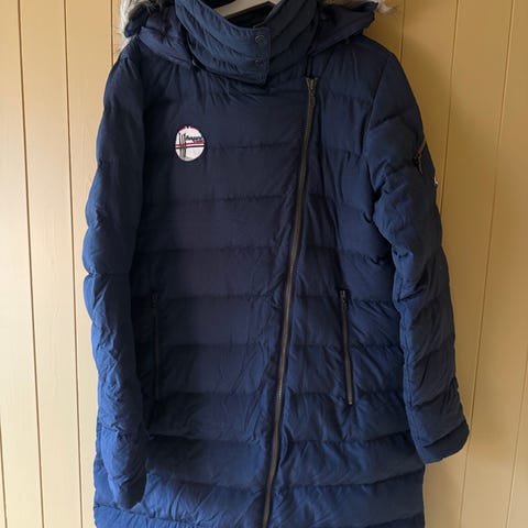 Marineblå. Ingen slitasje, den er ikke brukt mange ganger. God og varm. Matt i stoffet.