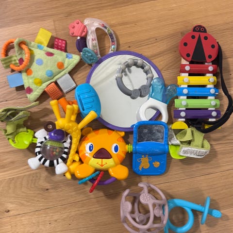 Stor lekepakke med treleker og bøker til baby. Veldig pent brukt og i god stand. Mye er kjøpt på Sprell og er merker som Sebra og Djeco.
