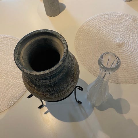 IKEA dekorasjonsvase i beige farge. Vasen har en høy, slank form og er laget av keramisk materiale. Passer til dekorasjon i hjemmet. Det er en knekk i den ene vasen, men den er limt igjen. Selges med svart pynt som er oppi på bildet.