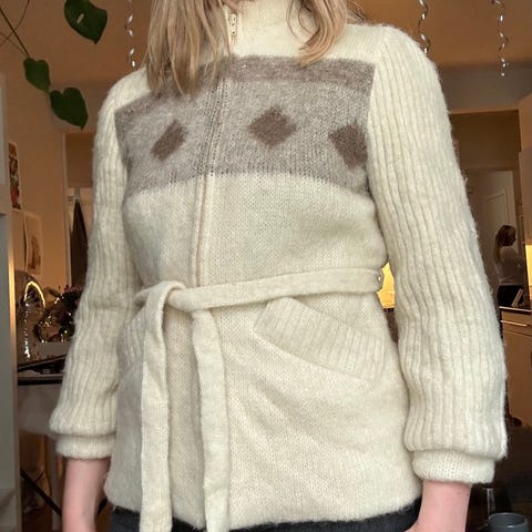 Heldre varm kremhvit ulljakke med gule detaljer XS