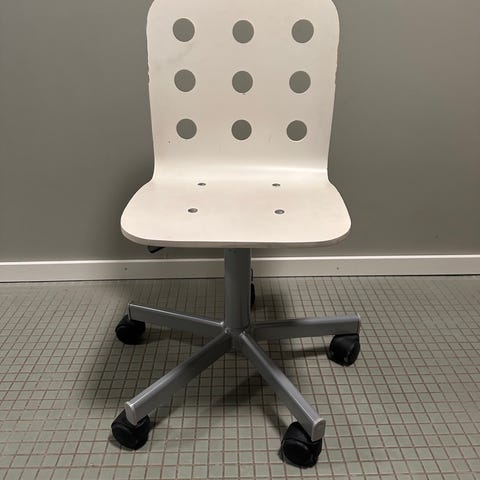 IKEA barnestol med hjul, en hvit og en rosa. Stolen har et sete og ryggstøtte med sirkulære hull, og en justerbar høyde med hjul under for enkel bevegelse. Egnet for barn.