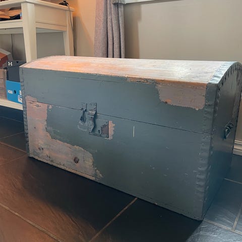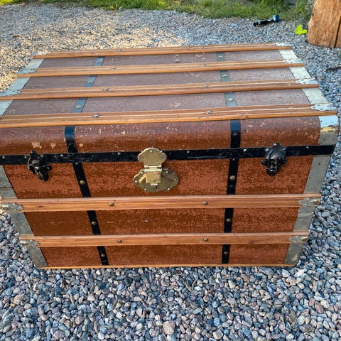 Tre kiste med hengslet lokk, laget av tremateriale med metallhåndtak på sidene. Kisten har en rustikk finish og låsemekanisme foran. Egnet for oppbevaring av ulike gjenstander.