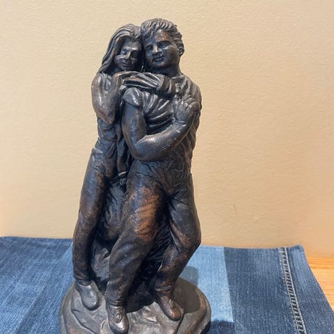 Ukjent skulptur i tre med i beige stein / marmor.. Figuren har detaljerte utskjæringer og står på en rund sokkel. Skulpturen viser en person med tradisjonelle klær og tilbehør. Passer som dekorasjon. Denne kommer trolig fra Østen / Singepore på 50-tallet.