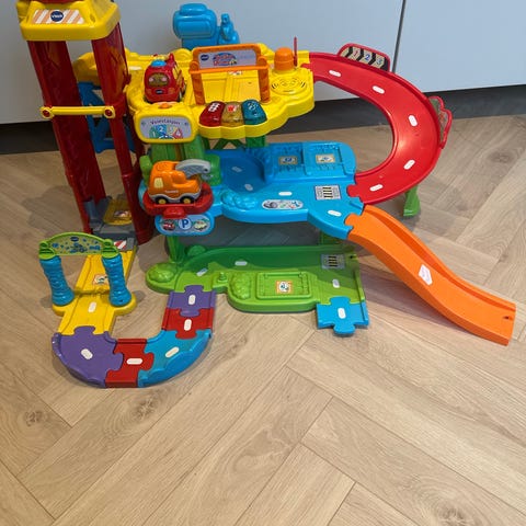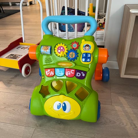 Den har ulike gøye leker på forsiden, bl.a. xylofon. Følger ikke med klosser.