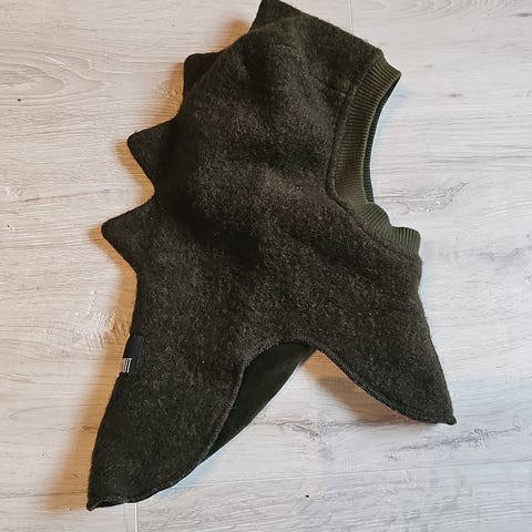 Huttelihut Dino ullbalaclava. Olivengrønn farge. Tovet ull utvendig og innvendig velour.