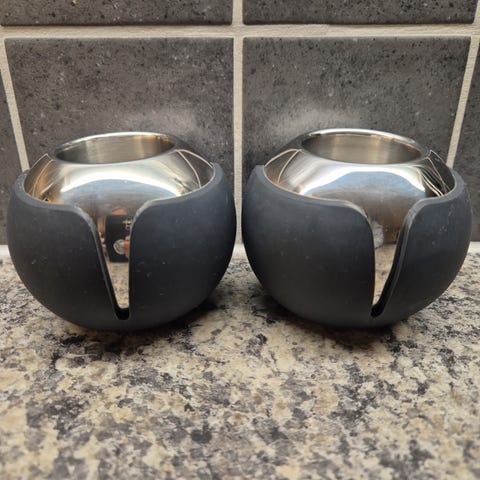 Som vist på bilder. Litt svart på den ene av "kjeglene". Godt mulig det kan skrubbes vekk, men har ikke tatt sjansen siden de skal selges.