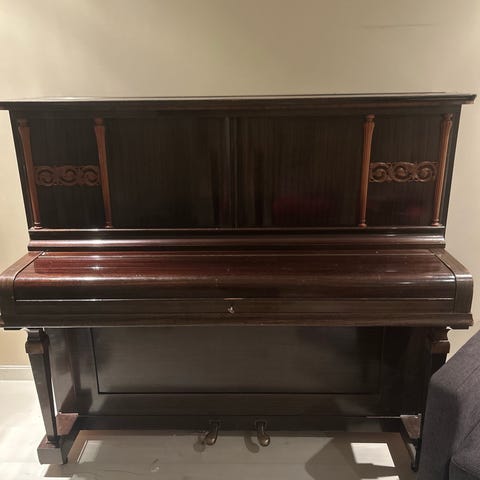 Zimmermann upright piano fra 1984. Pianoet har tre pedaler og et klassisk design i treverk. Passer til både private hjem og musikkundervisning.