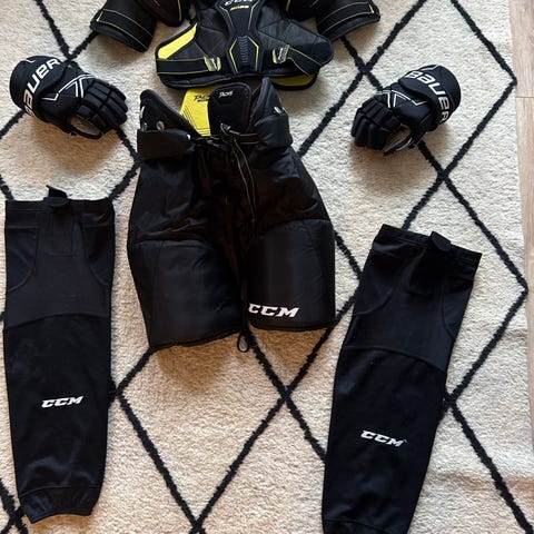 Pent brukt hockey bukse, vest, leggskinn, ,albuebeskytter og hansker fra CCM. Halsbeskytter fra Bauer. Hjelm fra Reebok.