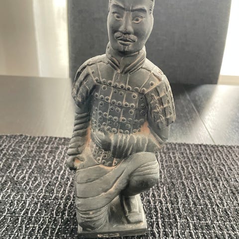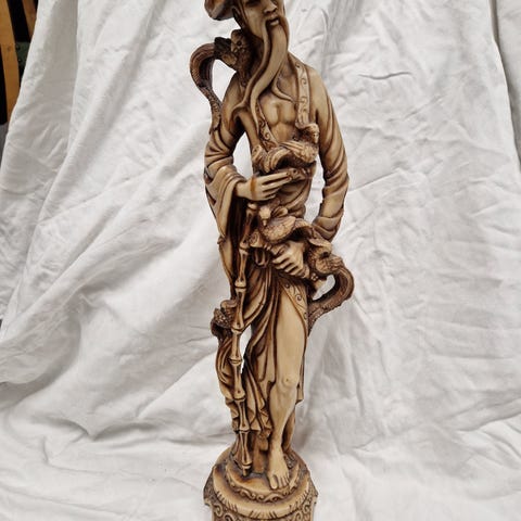 Skulptur laget i marmor. Skulpturen har en naturlig fargemiks av beige, brun og rødtoner. Den er håndholdt og har detaljert utførelse på figurene. Trolig fra Østen / Singapore på 1950-tallet. Høyde ca 10 cm, 14 cm bred