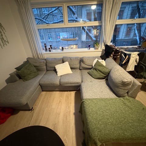 Supersøt grønn sofa gis bort mot henting. MÅ hentes 5. eller 6. januar. Ca 160cm bred. Har en penn-strek på seg men denne kan muligens vaskes. Pent brukt ellers og god kvalitet.