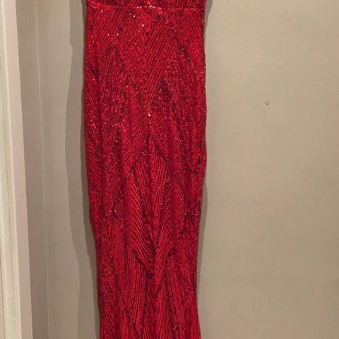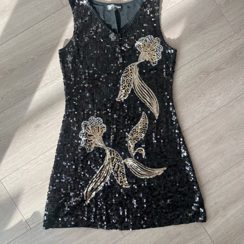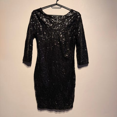 Kjole til spesiell anledning i svart farge, størrelse S. Kjolen har en tettsittende passform og er dekorert med paljetter, noe som gir et elegant utseende. Egnet for formelle anledninger. Kjolen har kun blitt brukt 2 ganger og er i veldig god stand.