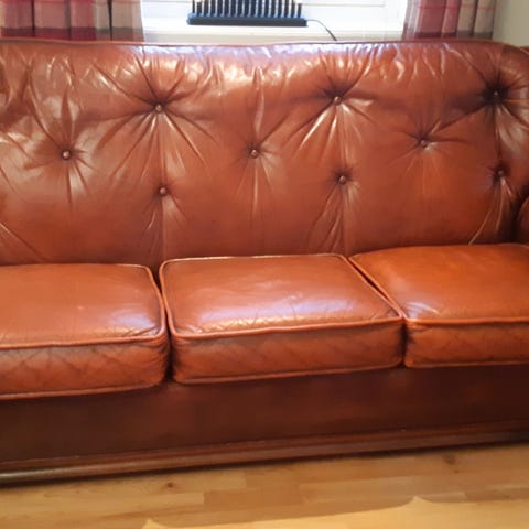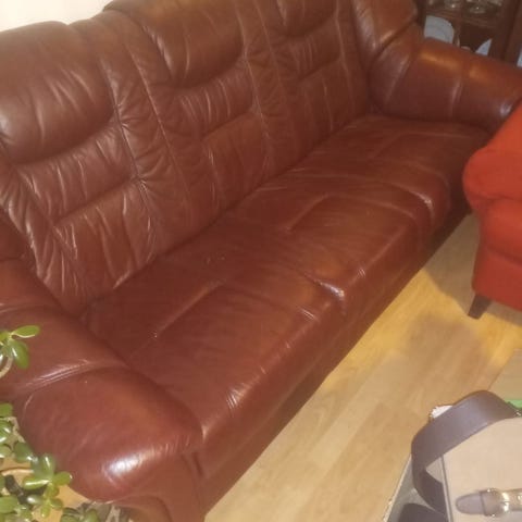 Eldre sofa, godt brukt men fantastisk å være oppi. Brunt skinn type rustikk 😊