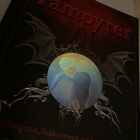 Boken "Vampyrer" omhandler temaer som hekseri, folketro og fascinasjon knyttet til vampyrer. Den har et mørkt omslag med illustrasjoner av flaggermus og en måne.