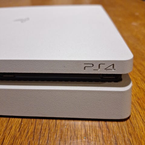 Sony PlayStation 4 spillkonsoll i svart farge. Inkluderer en trådløs kontroller, strømkabel og HDMI-kabel. Konsollen har kompakt design og er egnet for hjemmeunderholdning og spill. Vifte bråker litt, men det er visst ganske normalt på PS4. Fungerer som den skal.