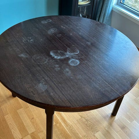 Det er brukt, men i god stand, uten synlige merker. Det er litt misfarging rundt bordplaten, men generelt er det i god stand.