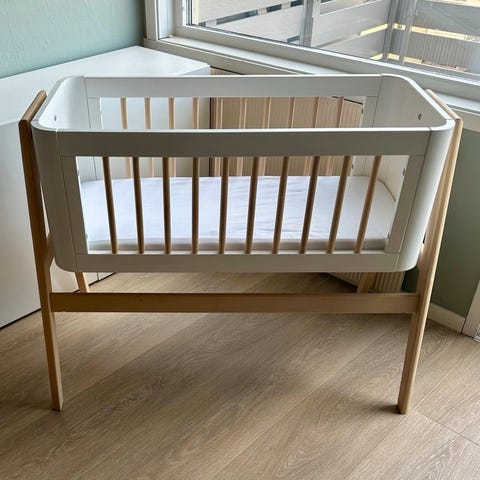 Troll Vugge barneseng i hvit farge. Har noen små bruksmerker men er ellers i fin stand. Følger med madrass og madrassbeskytter.